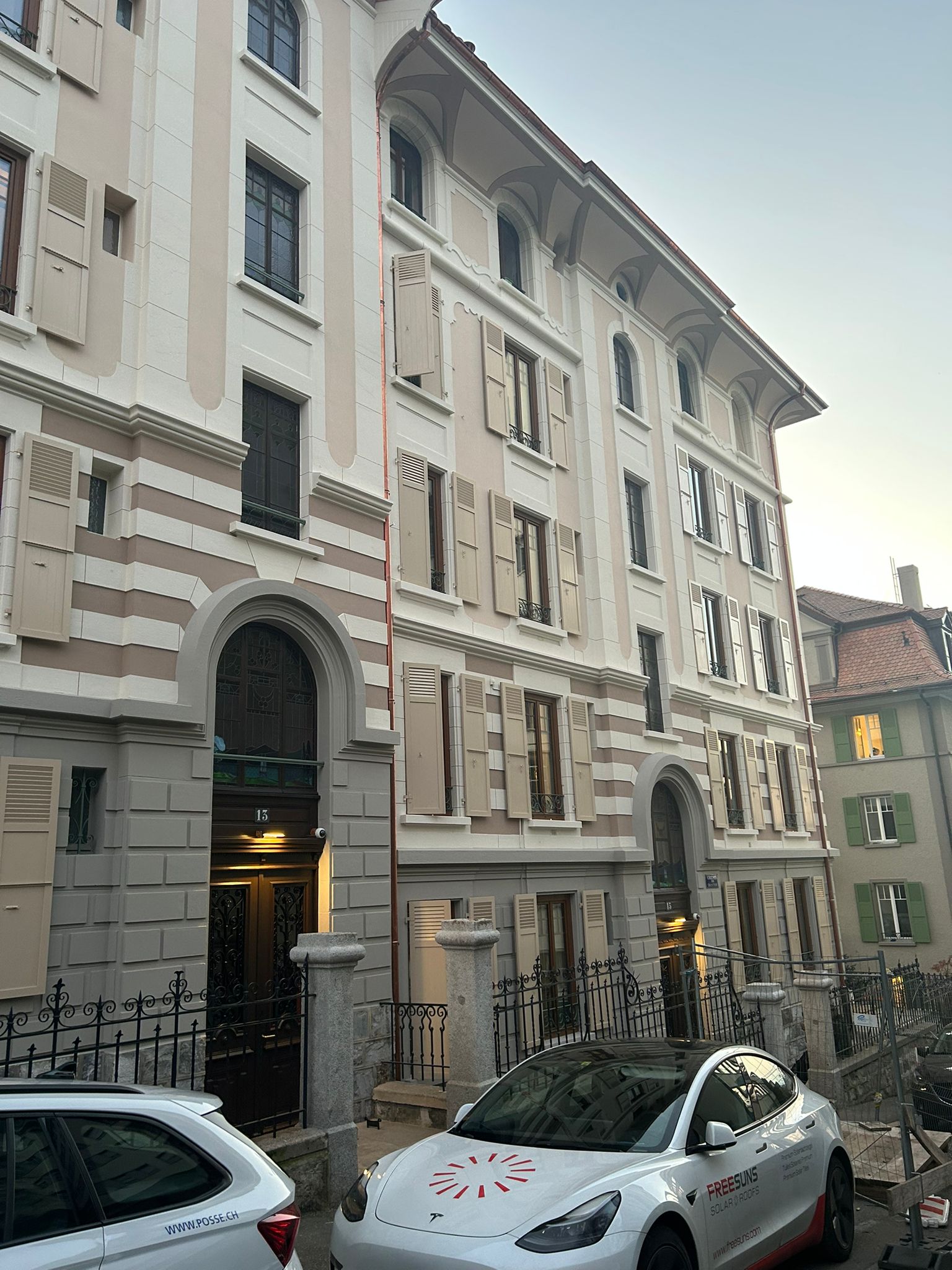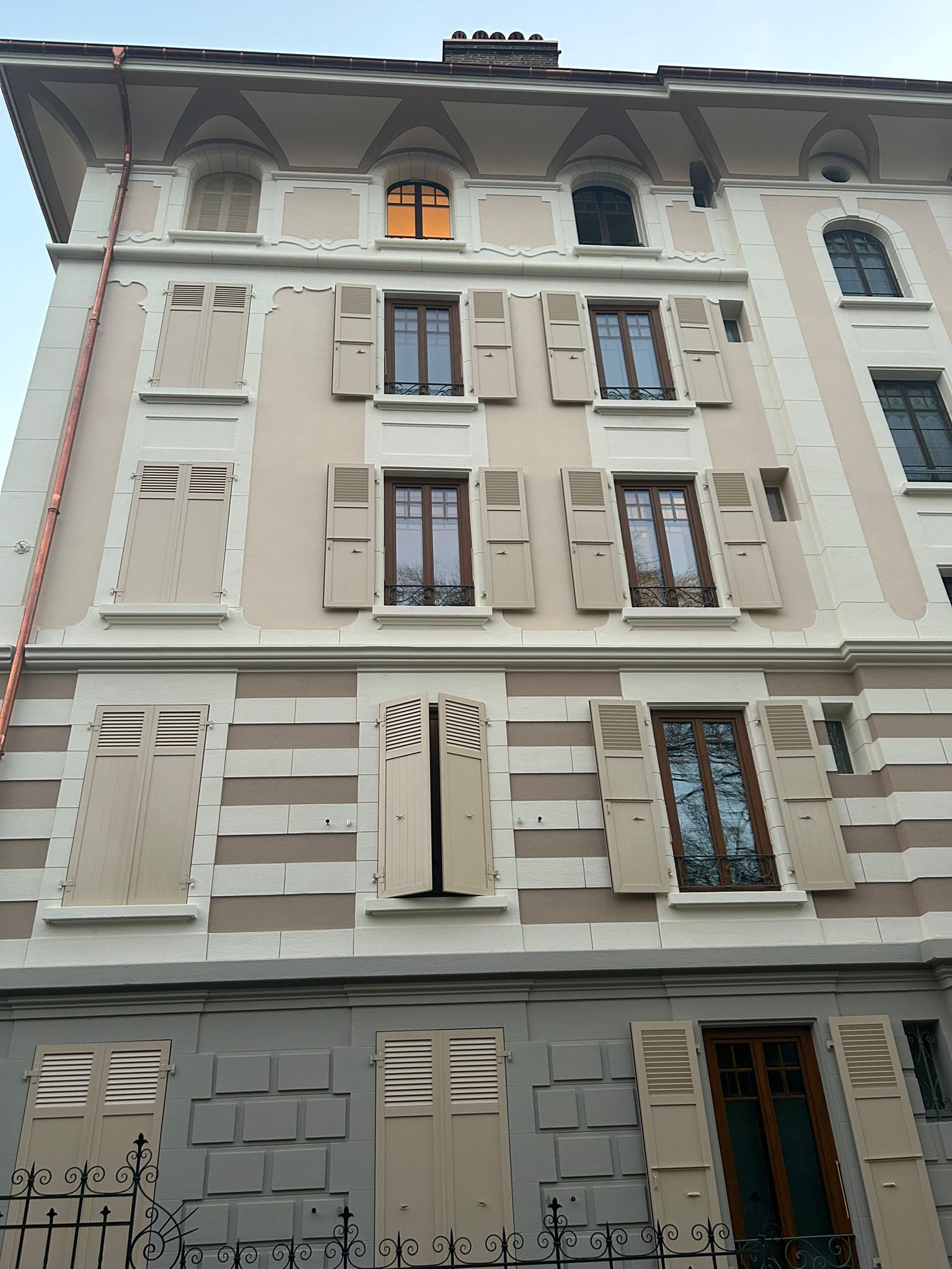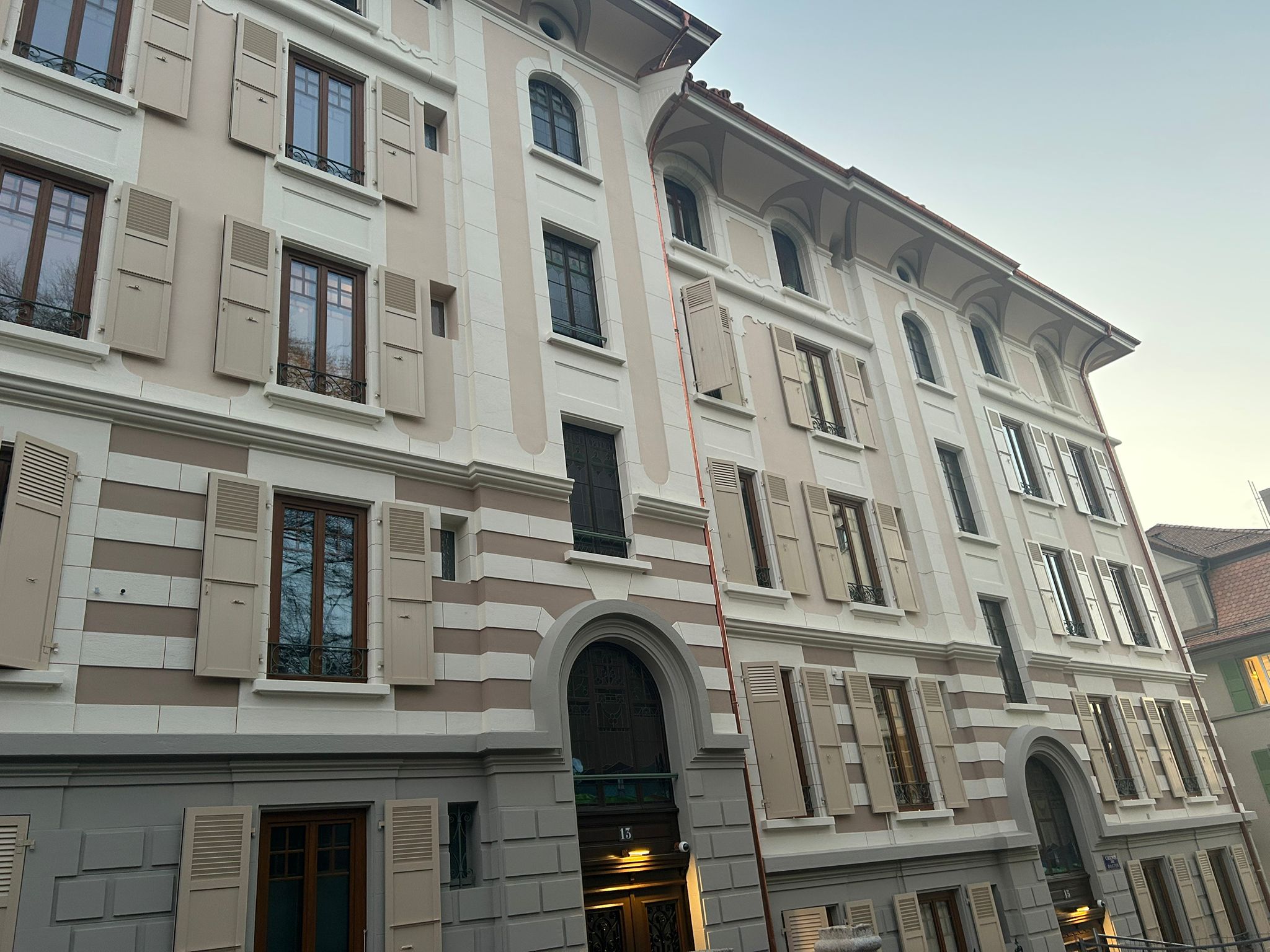 Situé au Chemin de Boston à Lausanne, ce projet met en valeur le savoir-faire artisanal appliqué à la rénovation de bâtiments de caractère. Les travaux réalisés comprennent le piquage des fonds pour l’assainissement des supports, le toilage complet et le lissage des surfaces pour une finition homogène, l’application de filets décoratifs pour souligner les encadrements et les éléments architecturaux, la reprise des avant-toits avec un lissage soigné et la pose d’un revêtement Scandatex, ainsi que l’application d’une peinture minérale respectueuse du support et durable dans le temps. L’objectif est de préserver l’authenticité du bâtiment tout en lui offrant une nouvelle durabilité et une esthétique raffinée. Grâce à une approche minutieuse et à des matériaux adaptés, cette rénovation redonne vie à la façade tout en respectant son identité historique.